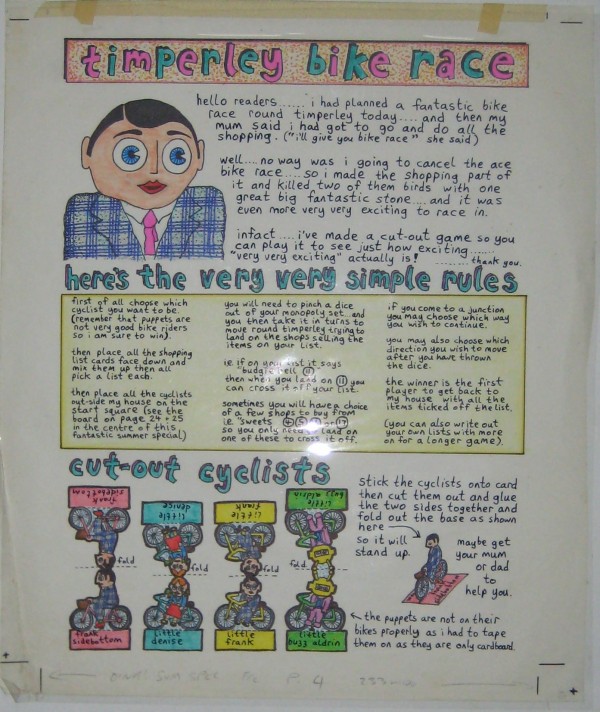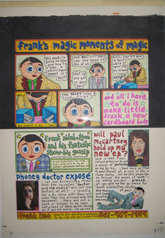 Franks page would use many different styles including comic strip, photostory, Fantastic showbiz gossip, games, cut out models, or even a feature relating to the theme of that particular issue.At first glance the artwork looks very naive but this is deliberately so, all done in the style that is Frank Sidebottom.