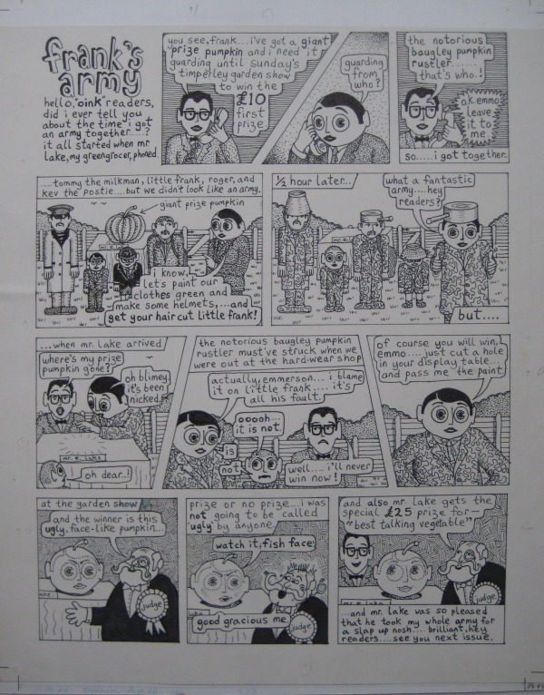 The Oink! offices were based in Manchester and Chris became good friends with one of the editors, Patrick Gallagher, who invited Chris on board. The first Frank page appeared in number 16 issued November 1986 and would continue to the final issue of November 1988.