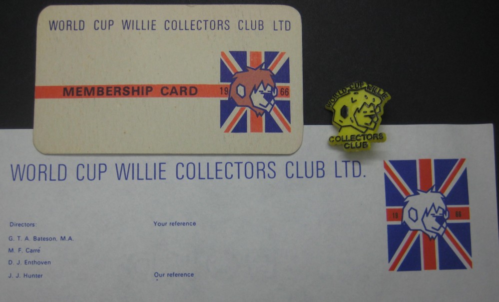 The World Cup Willie Collectors Club ran alongside the World Cup Collectors Club. Members would receive a regular newsletter on headed paper, a badge made by Plastoid and a membership card. Also included were sales sheets offering exclusive merchandise.