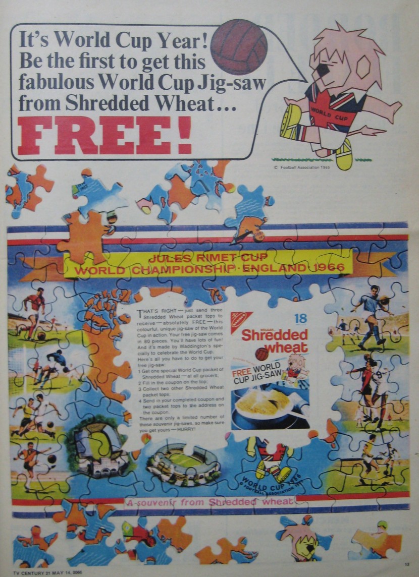 Nabisco gave away this jigsaw with two tops from Shredded Wheat cereal. The offer closed 31st July 1966. The 80 piece jigsaw was made by Waddingtons and was sent in either a plain envelope with leaflet or a printed envelope